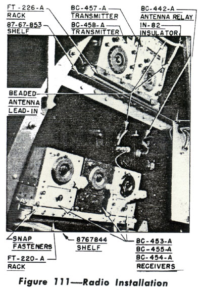 ![]() 3. Disconnect the ground wire from the side of the receiver rack. 4. Remove the lock wire from each of the four snap fasteners on the receiver mounting rack FT-220-A. 5. Remove plugs, PL-147, PL-151 and PL-152 from the FT-220-A receiver rack. 6. Lift FT-220-A rack up and aft and remove from the fuselage. 7. Remove the FT-221-A mounting from 8767-844 shelf by removing eight screws. (b) REMOVING TRANSMITTERS: 1. Remove the beaded antenna lead from the antenna post on the transmitter. 2. Remove the ground wire from the TT226-A rack on the side of the rack. 3. Remove the lock wire from the four snap fasteners on the rack. 4. Remove the two plugs, PI-154 and PL-156 from rack FT-226-A. 5. Lift the rack up and aft from the mount. ing FT-227-A. 6. Remove the mounting FT-227-A from the shelf, |