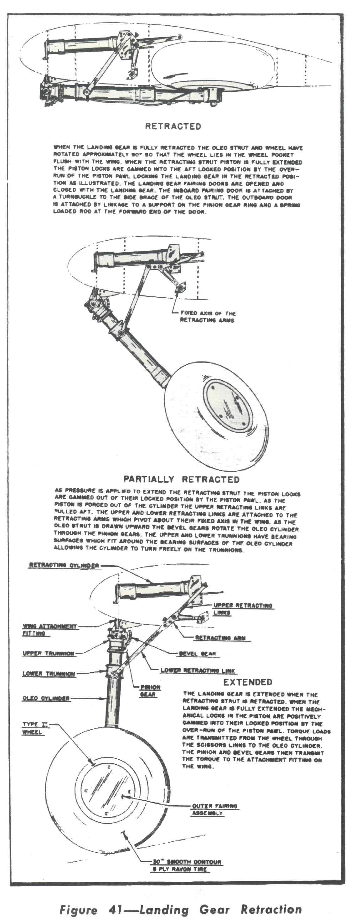 (c) Master Cylinder Unit. 1. GENERAL.-The brakes are actuated by the hydraulic brake master cylinders mounted on a support on the armor plate at Station 2A and actuated by a rod from the brake treadles. The brake cylinders and master cylinders are connected by flexible rubber hose and 5/16inch O.D. "Everdur" tubing. 2. DETAILED OPERATION OF THE MASTER CYLINDER UNIT-The views on figure 46 show the operation of the master cylinder unit when following the filling and bleeding procedure recom. mended by the manufacturer of, the unit. A description of the different views follows, reading from left to right: FIRST VIEW.-Unit in off (released) po. sition after being properly filled and bled, with the transfer valve closed. SECOND VIEW-Unit with the brake applied and with pressure in the system. THIRD VIEW-Unit in the parked position with the system under pressure. Same as second view, except that the force is maintained by the parking spring and ratchet instead of by the pressure on the brake treadle. (3) FILLING AND BLEEDING THE HY. DRAULIC BRAKE SYSTEM.-Figure 47 gives the method for filling and bleeding the brake system reconimended by the master cylinder manufacturer. (4) INSTALLATION AND DISASSEMBLY. (a) TO REMOVE THE LANDING GEAR ASSEMBLY FROM THE WING PANEL. 1. Disconnect the clevis end of the turnbuckle which controls the opening and closing of the inboard landing gear fairing door and the end of the cable from the outboard door to the support on the pinion gear ring. The inboard door turnbuckle is attached to the side brace and the outboard door cable is attached to a support on the underside of the oleo strut pinion gear. Disconnect the bearing end of the springloaded rod at the forward end of the outboard door. 2. Remove the screws attaching the landing gear leading edge fairing and outboard fairing door to the wing and remove the fairing. The leading edge section of the wing fillet must be removed to gain access to the inboard screws on the landing gear fairing at the leading edge. 3. Insert the jack point studs in the panel and jack the front and rear of the airplane until the landing gear wheels are off the ground. 4. Remove the bleeder screw at the brake Cylinder on the inner wheel fairing and drain the brake system. Disconnect the hydraulic brake hose at the fitting below the bleeder screw on the torque plate. Remove the two hose clamp fittings from their supports, one at the lower end of the oleo cylinder and the other at the lower trunnion. |