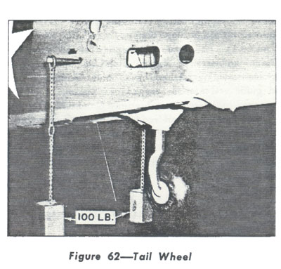 (a) The tail wheel assembly consists of a standard steerable knuckle unit, equipped with a wheel, a 12½ inch diameter, 4-ply rayon, smooth-contour casing, statically grounded, and an air-oil strut. The wheel disengages its steering splines at 30° ± 2° and will then castor through 360°. The cables connecting the horn to the pedals are equipped with springs to reduce taxiing shocks in the pedals and the control system. When retracted, the tail wheel is enclosed by clamshell-shaped doors, which form the under surface of the fuselage about the wheel. The tire should be inflated to 60 p.s.i. (See Fig. 62.)